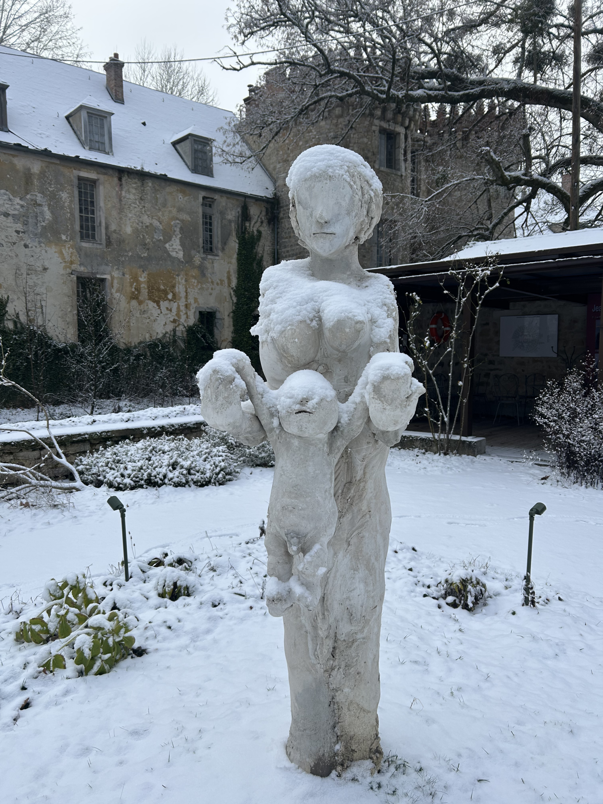 At first glance, these two Virgin and Child sculptures may surprise viewers with their grotesque and somewhat decrepit appearance. For Michel Charpentier, a devotee of these life-sized outdoor sculptures in gray cement, they reflect suffering humanity, as do his Cantatrices with their wide-open mouths. Referencing the statues of the cathedrals of Ile-de-France, these Virgin and Child sculptures - south and north, as if they had been placed before each of the church portals - are part of the Region's history, a history that the sculptor tints with humor and derision. They will be set against the backdrop of the walls of the old castle adjoining the garden, thus creating a link between the cathedral statues and the medieval origins of the castle. But this Middle Ages is indeed reinvented. Charpentier and Cocteau knew each other: it was in Rome, when Michel Charpentier was a resident at the Villa Medici, that Jean Cocteau noticed his strange sculptures. "It's wonderful! We must help this young man!" said the poet, moved by this vision of suffering humanity, imbued with the sacred. A vision that undoubtedly brings them together.